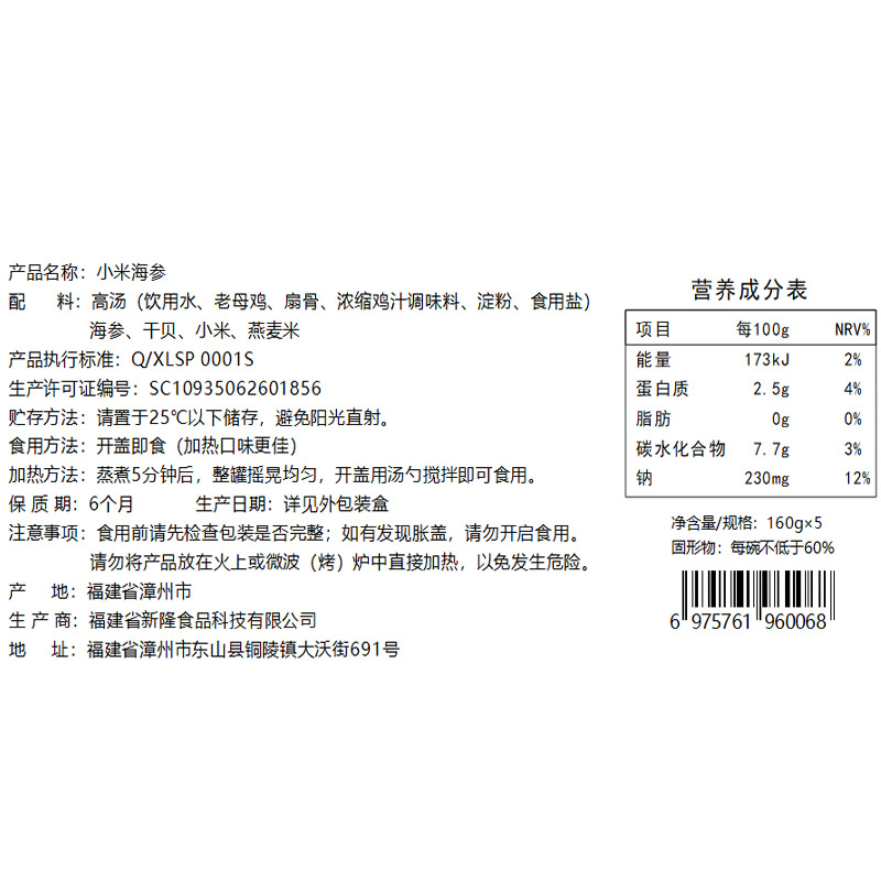160g*5Nome do produto: Pepino do Mar Enlatado com Painço
