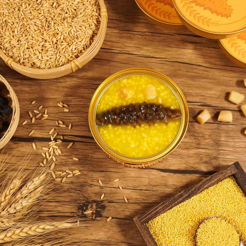 Pepino do Mar em Conserva com Milho combina perfeitamente pepino do mar fresco e milho, e tem um sabor rico com um toque de sabor do oceano, proporcionando uma experiência luxuosa na ponta da língua.