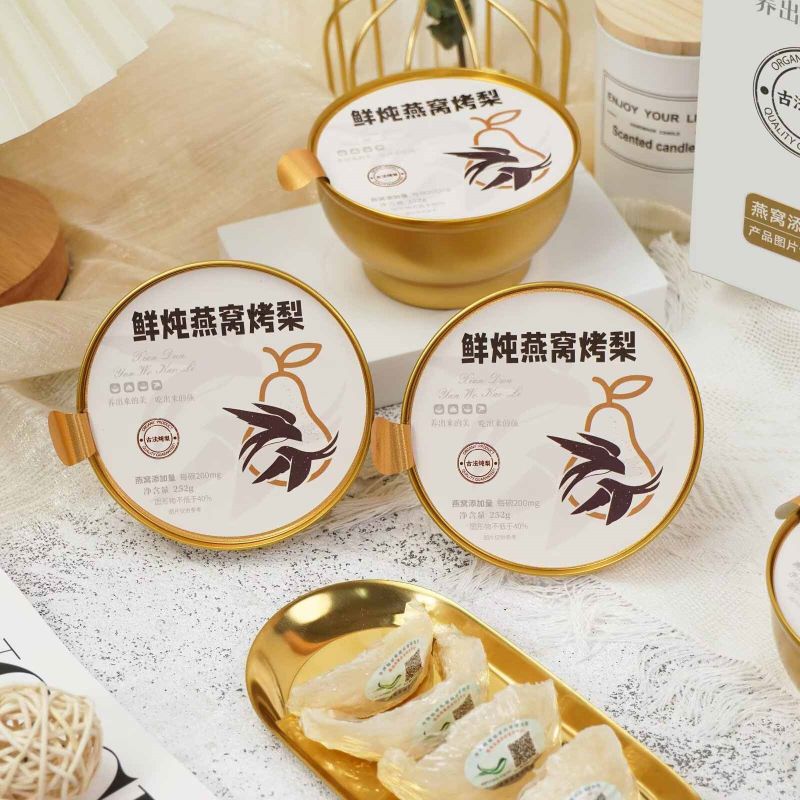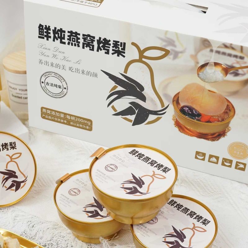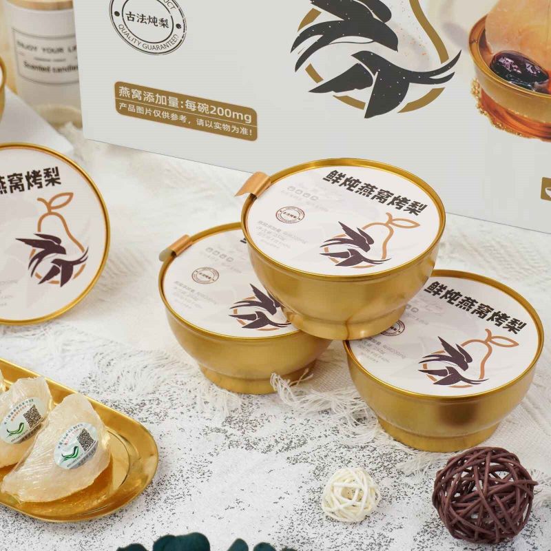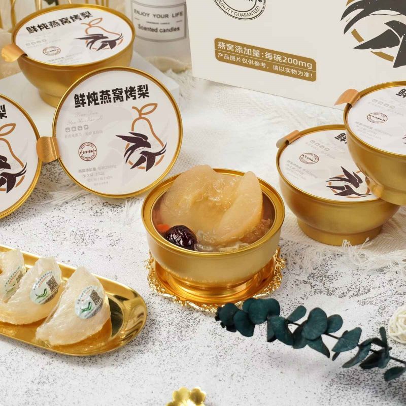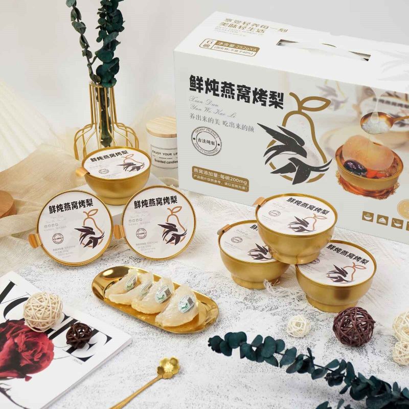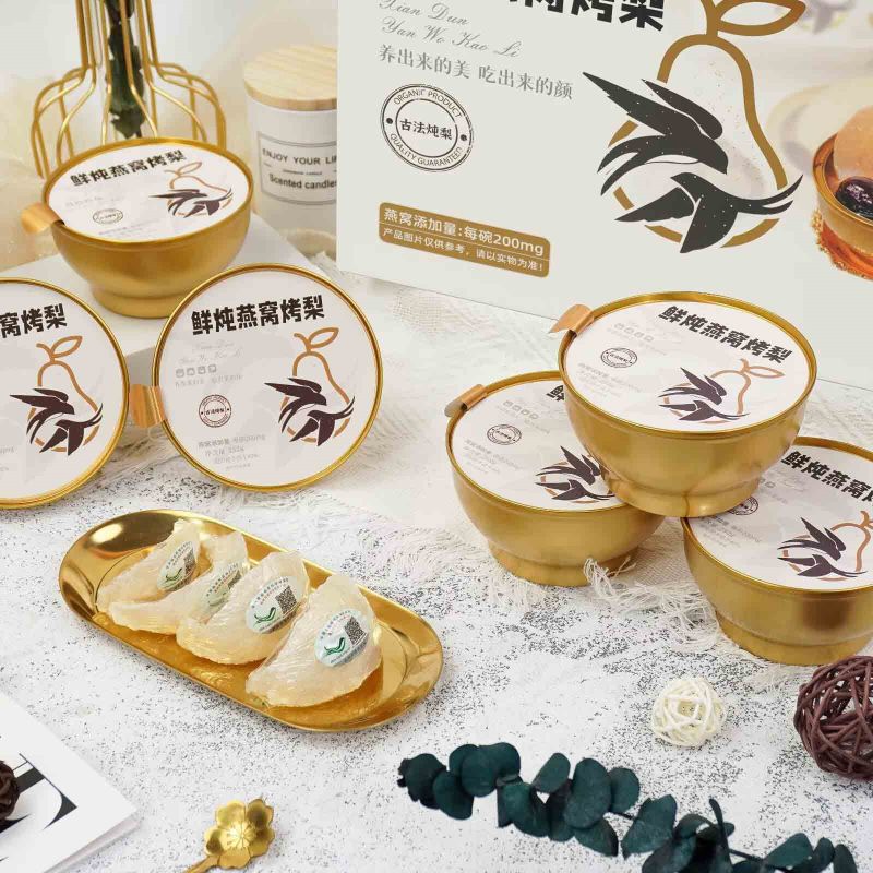 Temos o orgulho de apresentar o Ninho de Passarinho Estufado Fresco com Peras Grelhadas, uma caixa de presente única e deliciosa. O ninho de ave fresco é cuidadosamente cozido e habilmente misturado com as peras torradas com caramelo glutinoso, proporcionando um duplo banquete de textura e sabor. E a embalagem requintada mostra um sabor elegante. É uma excelente opção para presentear ou curtir, agregando beleza a cada momento.